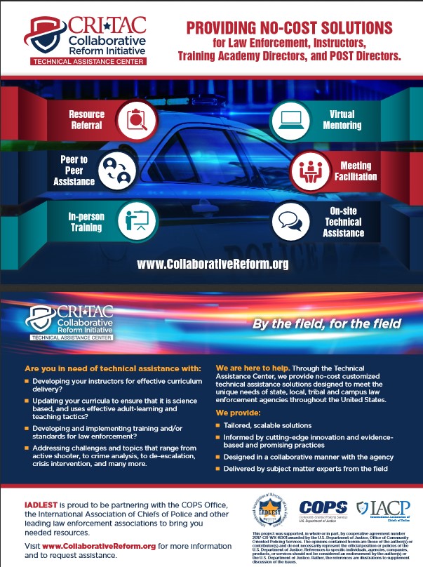Through CRI-TAC, IADLEST, in partnership with the U.S. Department of Justice’s Office of Community Oriented Policing Services (COPS Office), the International Association of Chiefs of Police (IACP) and eight additional extraordinary law enforcement organizations is providing tailored, critical technical assistance to state, local, campus, and tribal law enforcement agencies.